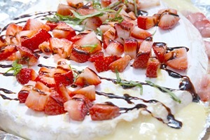 What you need: Brie wheel, olive oil, foil, strawberries, French bread, balsamic vinegar (optional)