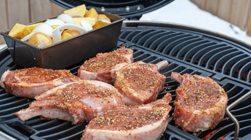 - Move the potatoes out of the way and sear the pork chops over the direct heat of the charcoal, brushing with the maple syrup mixture until a nice char and grill marks form – about two minutes per side.