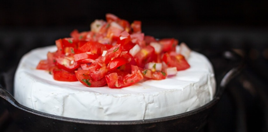 - Place the brie into the greased vessel and then top it with the bruschetta mix. Place the brie onto the grill over the unlit burners, or on the warming rack to bake for 15 minutes.