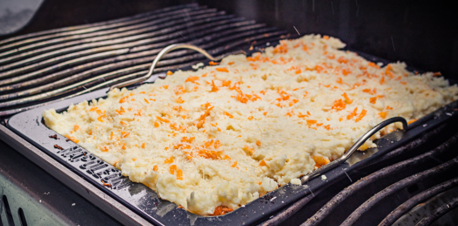 - Top the filling, which should have thickened nicely by now, with the mashed potatoes. Top with the remaining parmesan (or perhaps a sprinkling of cheddar). Swirl or scrape the top of the potatoes with a fork, then close the lid and turn up the two outside burners once more. Bake for about 20 minutes at 400°F until the top has browned and gotten crispy.