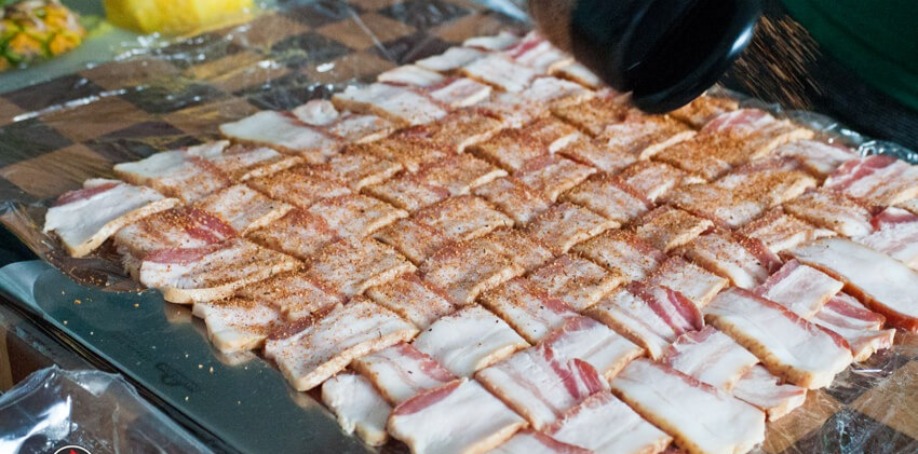 - Lay out some plastic wrap on a flat surface and use the bacon to create a tight weave pattern. Season the bacon with your favorite BBQ rub.