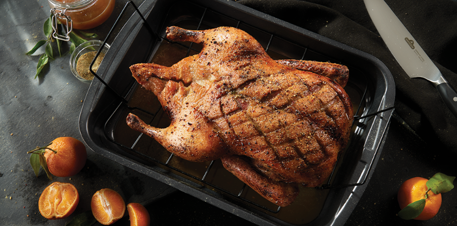 - Season the duck with salt and pepper to taste, as well as the Club House Ginger Garlic Stir Fry Seasoning, making sure to press the seasonings into the skin well.