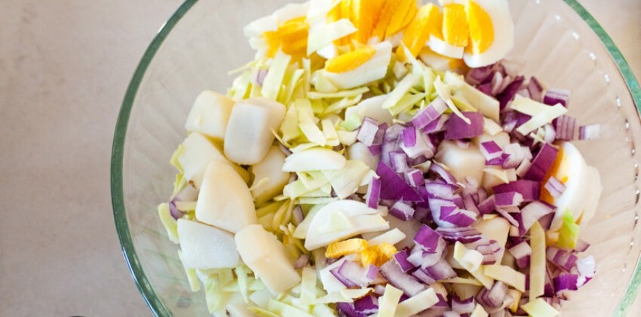 - Add the diced eggs, onion, and shredded cabbage. Once cooled a little, add the potatoes too. Using a spoon or spatula, gently toss everything together, making sure that each ingredient is well mixed and coated.