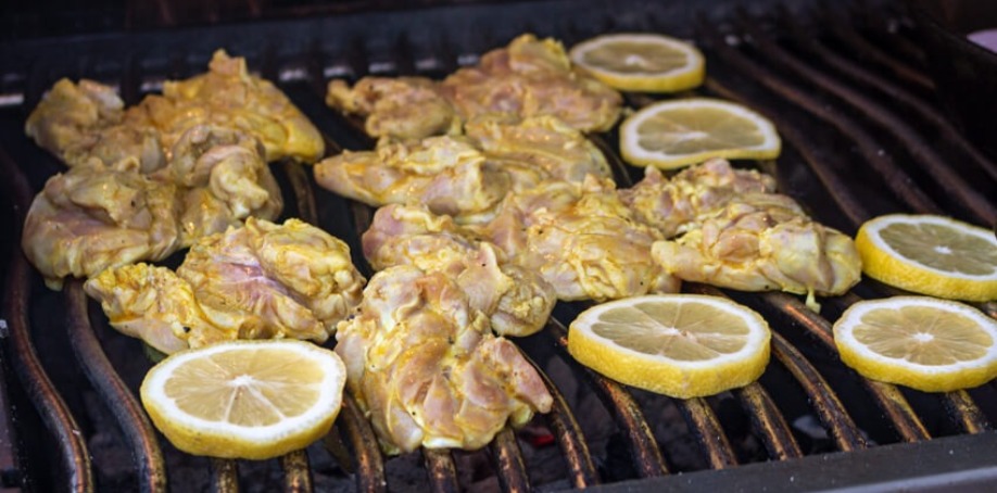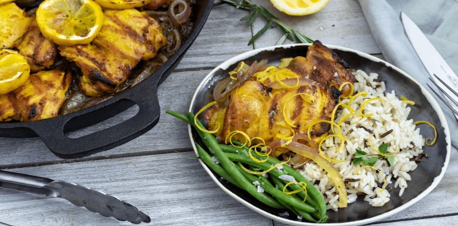 - When the grill is hot, pour the oil into the skillet and add the onions, stirring to coat. Sear the chicken thighs and sliced lemon on one side until grill marks form.