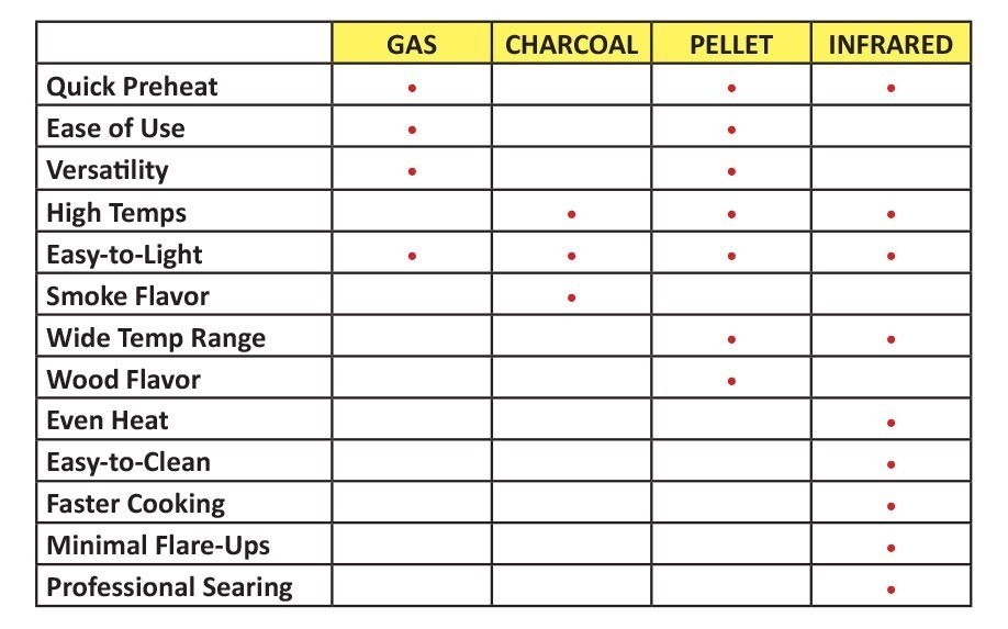 First and foremost, you need to understand the features of what each kind of grill has to offer. Take a look at the feature chart below!